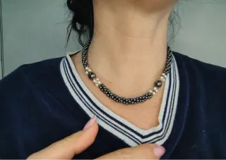 Elegante collana realizzata con perle bianche e sfere di ematite nera. - Design a spirale. - Perle di diverse dimensioni. - Chiusura sicura.