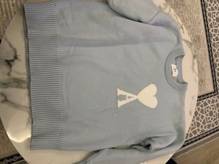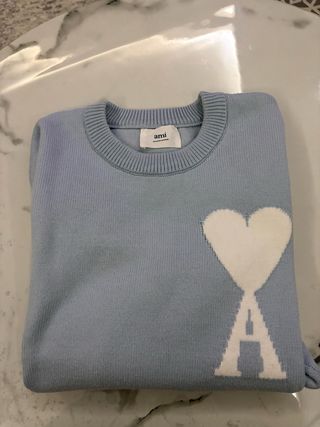 Maglione girocollo Ami Paris in un bel colore azzurro. Presenta l'iconico logo a forma di cuore con la A stilizzata sul petto. - Logo a cuore bianco e A. - Girocollo a costine. - Maniche lunghe.