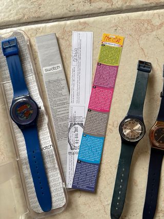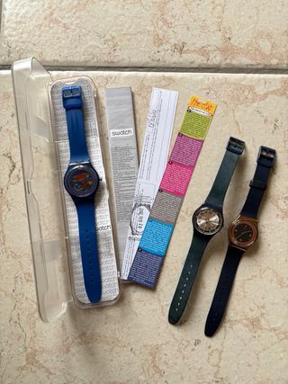 Set di tre orologi Swatch. - Orologio blu con quadrante colorato e meccanismo a vista New Gent 2011. - Orologio con cinturino blu scuro e quadrante dorato. - Orologio con cinturino verde scuro e quadrante argentato. I tre orologi presentano difetti come da foto, come passanti mancanti o vetri scheggiati, non sono usati da parecchi anni ormai, bisogna cambiare batteria.