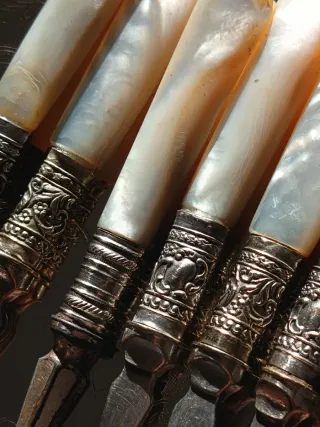 N. 6 forchettine miste vintage da dolce con manici in madreperla e raccordo argento 800. I raccordi presentano decori a sbalzo. Ideali per occasioni speciali o per aggiungere un tocco di classe alla tavola.