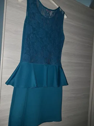 Elegante vestito con dettagli in pizzo e peplo.Colore Verde petrolio - Scollo rotondo con inserto in pizzo. - Maniche corte. - Vita segnata con peplo. - Gonna dritta.