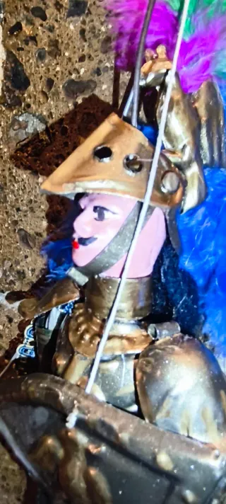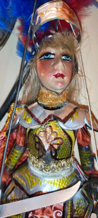 Pupo siciliano Vintage decorato a mano . Non riesco ad identificarlo perché è un personaggio poco Comune. . Altezza del Pupo è Cm 40 misurato dai tacchi fino all'estremità dell'elmetto ... Vestiti di stoffa e passamanerie pregiate. Armatura in lamierino di ottone. Ben conservato negli anni...