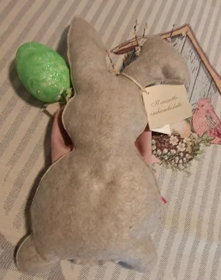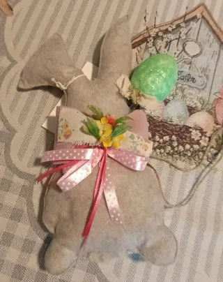 Adorabile coniglietto pasquale decorativo, perfetto per aggiungere un tocco festivo alla tua casa. - Realizzato in morbida stoffa di feltro - Dettagli floreali e fiocco rosa con pois.