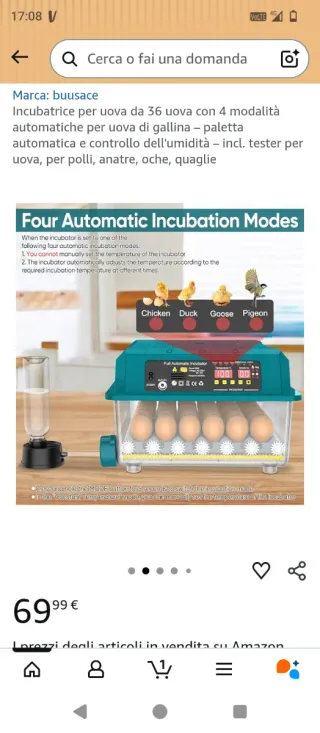 Incubatrice automatica per 36 uova, mai usata. - Capacità: 36 uova. - 4 modalità automatiche. - Controllo dell'umidità. - Include tester per uova. - Adatta per polli, anatre, oche e quaglie. Disponibilità 11 pezzi