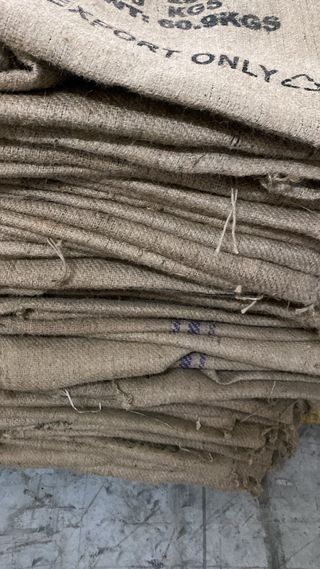 Questi sacchi vintage sono ideali per dare un tocco rustico ai tuoi spazi. Realizzati in juta, presentano un design unico. - Motivo decorativo con chicchi di caffè e onde stilizzate. - Colore naturale della juta con dettagli in verde acqua e bordeaux. - Scritta CAFÉS DE parzialmente visibile. - Disponibilità limitata
