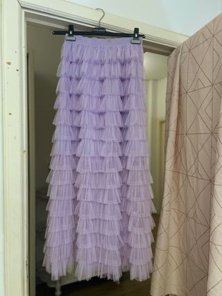 Gonna lunga viola con un design a balze sovrapposte. - Tessuto leggero e svolazzante. - Vita elasticizzata per un comfort ottimale. - Lunghezza maxi.