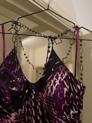 Elegante tuta lunga con una fantasia unica. - Scollo a V con spalline sottili. - Lunghezza maxi. - Dettagli con catenina decorativa sul collo.