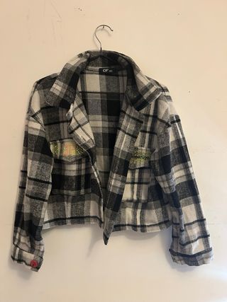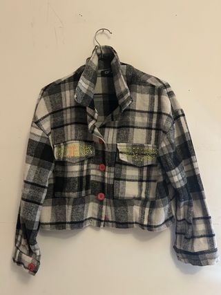 Giacchino corto a quadri con dettagli luminosi sulle tasche. - Chiusura con bottoni rossi. - Maniche lunghe. - Collo a camicia.