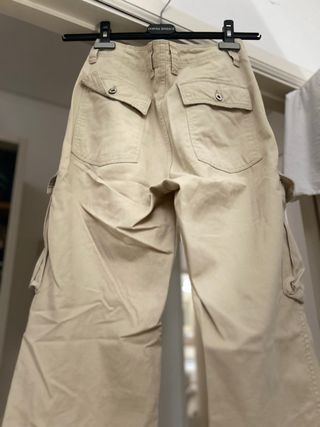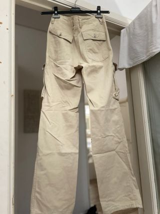 Jeans cargo in tessuto color beige. - Tasche laterali. - Chiusura con bottone e zip. - Passanti per cintura.