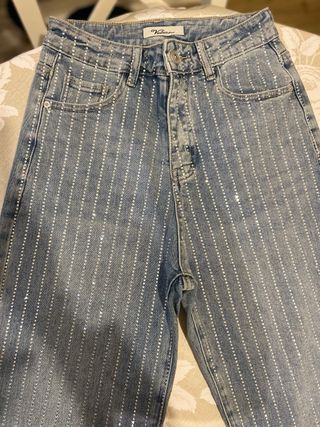 Jeans palazzo con un design unico e scintillante. - Decorazione a righe con strass. - Vestibilità palazzo ampia e comoda.