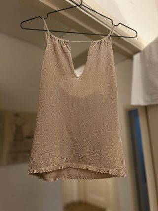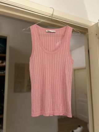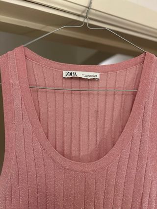 Canottiera Zara con una finitura metallizzata che aggiunge un tocco di brillantezza. Il tessuto a coste la rende aderente e confortevole. - Scollo rotondo. - Tessuto a coste. - Finitura metallizzata.