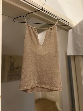 Top con un design elegante e scintillante, perfetto per aggiungere un tocco di luce al tuo guardaroba. - Tessuto metallizzato effetto oro. - Scollatura a V profonda. - Spalline sottili. - Orlo rifinito.