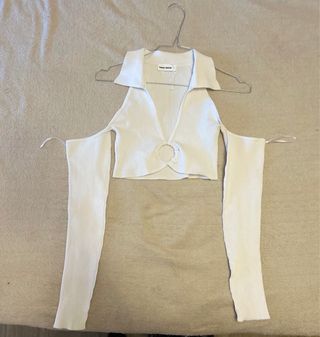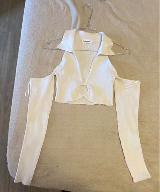 Top corto con un design unico e moderno. - Scollo a V profondo con dettaglio ad anello. - Maniche lunghe separate. - Colletto a camicia.