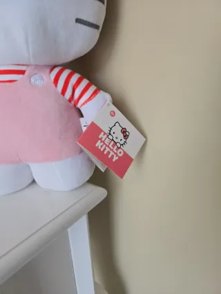 Peluche di Hello Kitty, un'edizione speciale da collezione. - Design classico di Hello Kitty. - Fiocco rosso. - Salopette rosa con maglia a righe bianche e rosse.