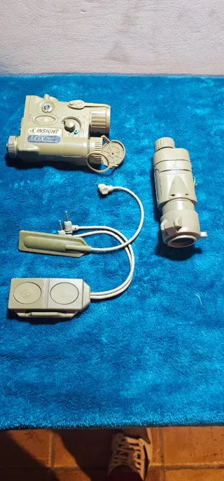 Visore notturno Insight AN/PVS-14 in colorazione sabbia. - Unità principale. - Batteria. - Cavo di alimentazione.