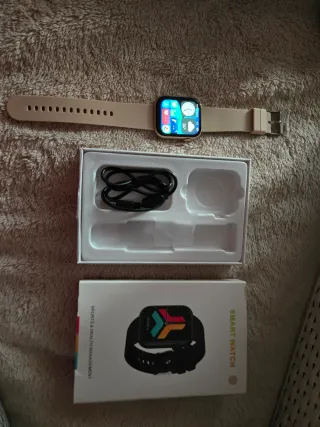 Smart Watch con cinturino beige e cassa color oro. Include scatola e cavo di ricarica. - Scatola originale. - Cavo di ricarica incluso.
