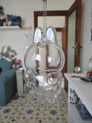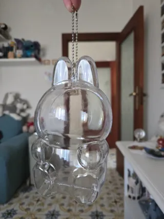 Porta Labubu trasparente, perfetto per collezionisti o come accessorio. - Materiale: Plastica trasparente. - Design: A forma di coniglietto. - Dettagli: Include una catenella per appenderlo.