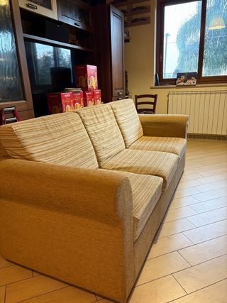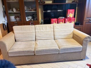 Comodo divano a tre posti, perfetto per il soggiorno. - Rivestimento in tessuto resistente. - Design moderno e versatile.
