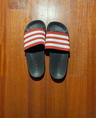 Comode ciabatte Adidas con design a tre strisce. - Fascia superiore rossa con tre strisce bianche. - Logo Adidas stampato sulla soletta.