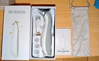 Dispositivo per la pulizia del viso HURRISE. - Modello PC-201. - Include cavo di ricarica USB. - Tre testine di ricambio incluse. - Custodia in tessuto per il trasporto.