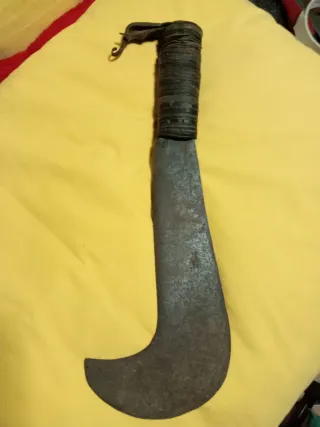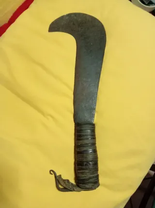 Antica roncola da contadino, con lama curva e manico avvolto in tondi di cuoio - Lama in metallo scuro, che si affina sul Manico avvolto in cuoio. - segni del tempo e dell'uso.