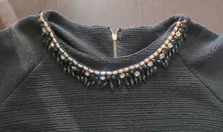 Elegante vestito nero corto, perfetto per ogni occasione. Presenta un dettaglio di perline scintillanti sul collo. - Tessuto a coste. - Collo decorato con perline e strass. - Maniche corte.