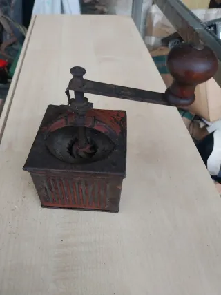 Macinino da caffè vintage in metallo con finiture rosse e manovella in legno. - Struttura in metallo verniciato. - Dettagli a coste sul corpo. - Manovella con pomello in legno scuro.