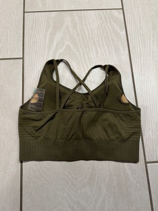 Top sportivo Women's Best in un elegante color verde oliva. Perfetto per l'allenamento. - Design con spalline incrociate sulla schiena. - Tessuto morbido e traspirante. - Fascia elastica a costine sul fondo per un maggiore supporto.