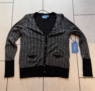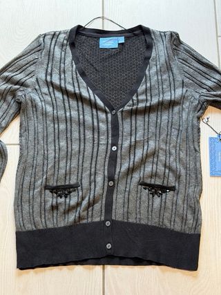 Cardigan con scollo a V e chiusura a bottoni. - Design a coste verticali. - Dettagli con perline sulle tasche. - Polsini e fondo neri a contrasto.
