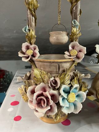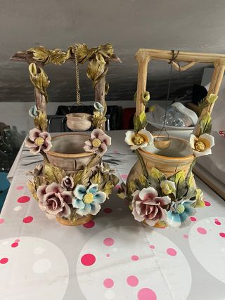 Delizioso set di due pozzi decorativi in stile vintage, perfetti per aggiungere un tocco di charme a qualsiasi ambiente. - Design floreale elaborato con fiori colorati. - Struttura in ceramica con dettagli in fogliame. - Catena e secchiello pendenti inclusi.