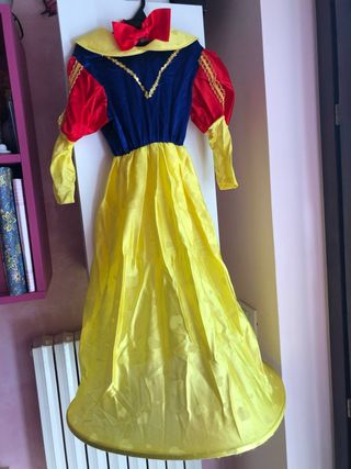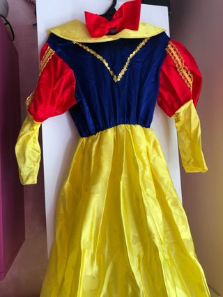 Vestito di carnevale Biancaneve, taglia 3-4 anni, indossato 1 volta - Corpetto blu in velluto con dettagli dorati. - Maniche rosse a sbuffo. - Gonna gialla ampia e luminosa. - Collo e fiocco rossi. - Lunghezza fino ai piedi.