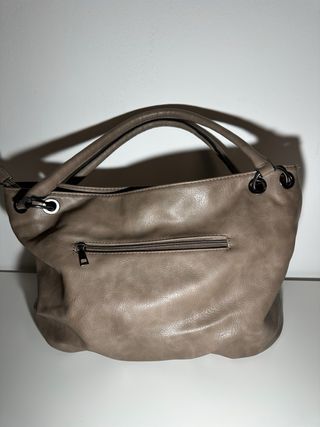 Borsa da donna dal colore taupe, versatile e capiente. Perfetta per ogni occasione. - Ciondolo a forma di cuore applicato. - Manici comodi per il trasporto. - Dettagli metallici sui manici.