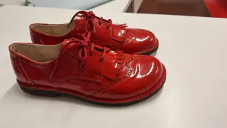 Eleganti scarpe basse in vernice rossa, perfette per aggiungere un tocco di stile. - Dettaglio con frange decorative. - Lacci rossi. - Suola in cuoio.