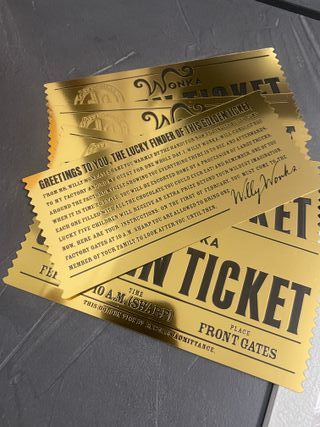 Set 5 biglietti d'oro di Willy Wonka, perfetti per collezionisti o fan del film. - Design dorato lucido. - Logo Wonka in rilievo. - Dettagli stampati come data, ora e luogo.
