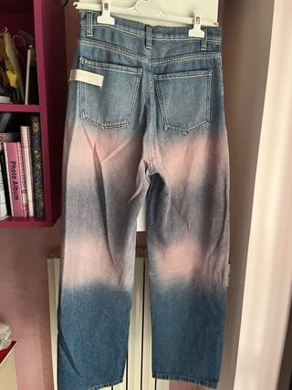 Jeans a vita alta con un particolare effetto tie-dye sfumato dal blu al rosa. - Design a vita alta - Effetto tie-dye sfumato - Gamba dritta