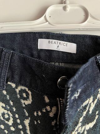 Jeans Beatrice B con una bellissima fantasia. - Fantasia astratta bianca su fondo blu scuro. - Modello a vita alta. - Gamba dritta.