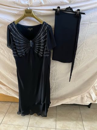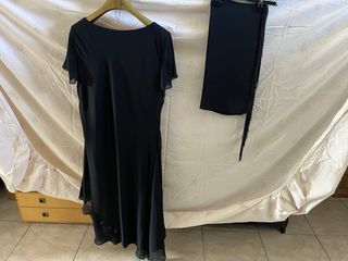 Elegante abito lungo nero con dettagli scintillanti sul corpetto. - Corpetto decorato con strass. - Maniche corte in chiffon. - Gonna con sovrapposizione e balze sul fondo. Comprensivo di stola Indossato una volta