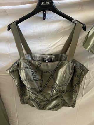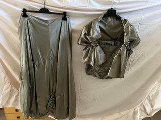 Elegante completo composto da gonna, top e stola in una bellissima tonalità verde. - Dettagli con strass applicati sulla gonna e sul top. - Tessuto leggero e luminoso. - Stola con fiocchi decorativi. Indossato una sola volta