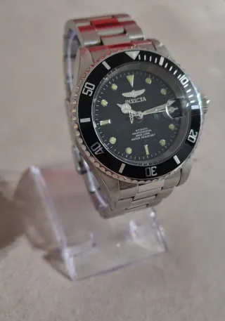 Orologio da polso Invicta con movimento automatico e design subacqueo. - Cassa e bracciale in acciaio inossidabile. - Quadrante nero con indici luminosi. - Lunetta girevole unidirezionale. - Datario a ore 3. - Resistente all'acqua fino a 200 metri. - Completo di scatola - Spedizione in tutto il mondo