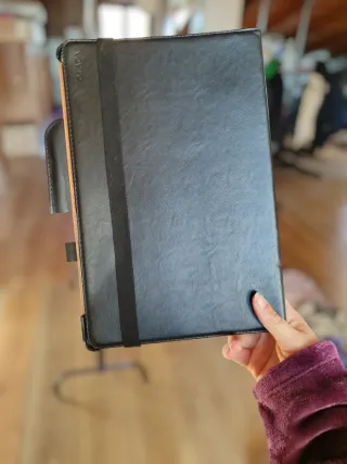 Custodia protettiva nera a libro (folio), specificamente progettata per il Samsung Galaxy Tab S7 FE. È dotata di un comodo elastico di chiusura per mantenere la cover saldamente chiusa e un portapenne integrato per la S Pen. La cover supporta la funzione di accensione/spegnimento automatico (auto sleep/wake) del tablet. Può essere piegata per fungere da supporto con diverse angolazioni di visualizzazione, ideale per guardare film o scrivere..