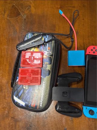 Accessori per Nintendo Switch. - Custodia per giochi Mario Kart. - Joy-Con grip. - Due porta giochi - Un adattatore blu.