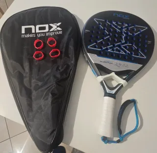 Vendo Racchetta da padel NOX Cobalt completa di custodia praticamente nuova usata solo 3 volte..vendo perché non compatibile con il mio gioco ..posso anche scambiare con bullpadel vertex 4 light series..bianca nera - Custodia nera con logo NOX. - Quattro elastici rossi inclusi. - Racchetta con design nero e blu. - Impugnatura bianca con laccetto.