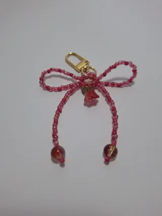 Grazioso portachiavi a forma di fiocco realizzato con perline rosse e rosa. Fatto a mano - Fiocco decorato con perline. - Ciondolo a forma di bocciolo di rosa. - Dettagli in metallo dorato. - Perle decorative alle estremità. Anche personalizzazioni su commissione #fattoamano #perline #portachiavi
