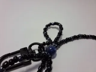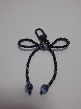 Portachiavi artigianale a forma di fiocco, realizzato con perline nere e dettagli blu. Fatto a mano - Chiusura a moschettone in metallo nero. - Perle centrali e finali in vetro blu. - Design unico e colorato. Anche personalizzazioni su commissione #fattoamano #perline #portachiavi
