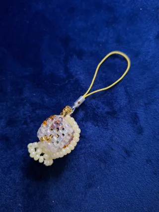 Delizioso draghetto realizzato a mano con perline. - Colore: viola e giallo. - Dettagli in perline bianche. - Perfetto come accessorio per cellulare o portachiavi.