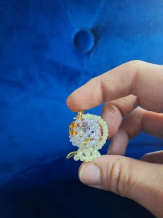 Grazioso portachiavi realizzato con perline che raffigura un piccolo mappamomdo. Ideale per personalizzare chiavi o zaini. - Perline colorate e trasparenti. - Dettagli dorati. - Cordino giallo per aggancio.