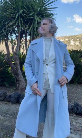 Elegante cappotto lungo in una bellissima tonalità azzurra. - Design a doppio petto. - Tasche frontali. - Collo a revers classico. in negozio costa 180€
