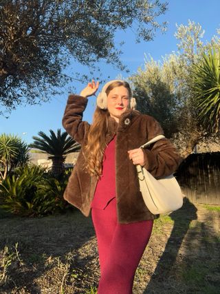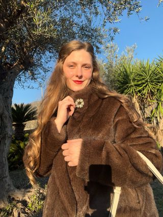 Elegante pelliccia sintetica marrone, perfetta per aggiungere un tocco di classe al tuo guardaroba. - Dettaglio di un bottone gioiello frontale. - Materiale morbido e confortevole.