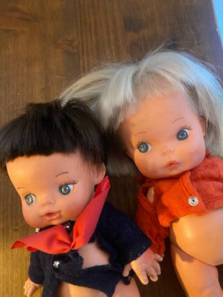 Coppia di bambole vintage Furga. - Bambola con capelli neri e fiocco rosso. - Bambola con capelli biondi e giacca arancione.