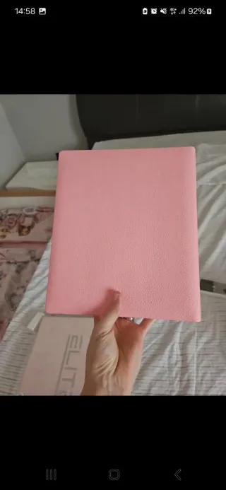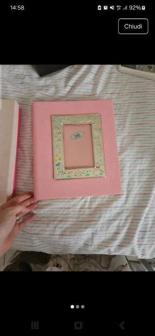 Diario con copertina in tessuto e cornice portafoto. - Copertina rosa con cuoricini. - Cornice portafoto interna. - Marca BELTRAMI visibile.